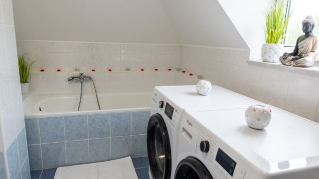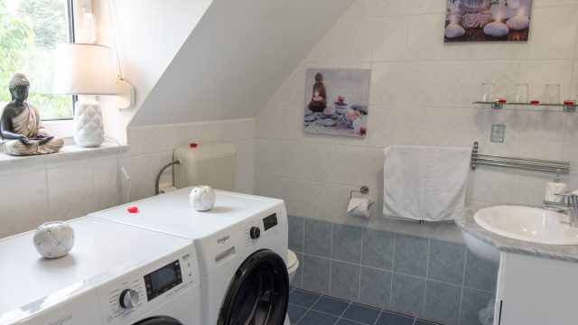 Emeleti tágas fürdő, nagy ablakkal, kényelmes nagy káddal, hangulatos fényekkel. Mosó- és szárítógéppel. Hajszárító, hajvasaló itt is található. Igény esetén, babakád, bili bekészítése is kérhető.