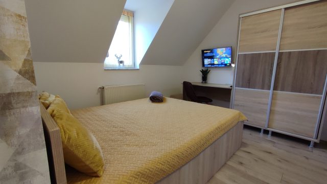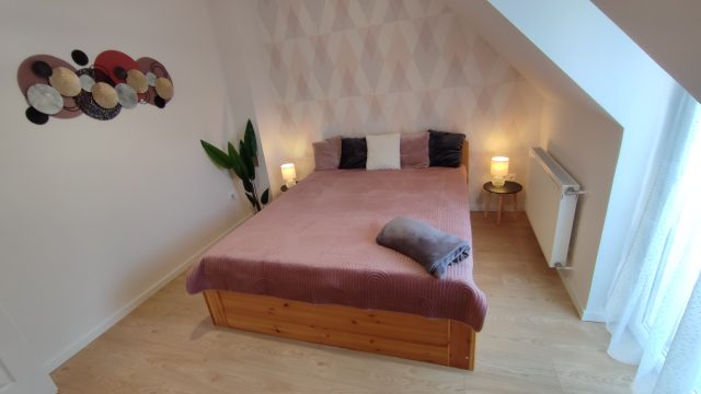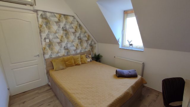 A ház legkisebb, de egyben legaranyosabb szobája, ahol majdnem mindig reggeli napsütésre ébredhetünk! A franciaágy (160*200) keményebb matraccal kimondottan kényelmes, akár két felnőttnek is, Nagy szekrény, íróasztallal, székkel, okos tv, Netflix-szel. Otthonos hangulata miatt mindig ez az a szoba, amit elsőnek lefoglalnak a vendégeink!