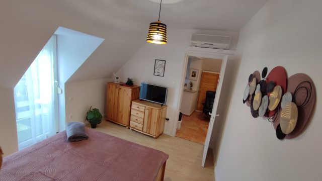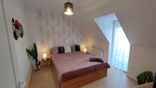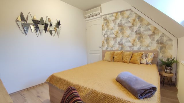 A ház legszebb szobája hangulatos erkéllyel, ami derült idő esetén éjszakai csillagnézés helyszíne is lehet. Extra kényelmes francia ággyal, kérésre akár kétszemélyes paplannal, tágas szekrényekkel, légkondival, okos tv-vel felszerelve. Igény esetén babaágy bekészítés, természetesen ide is kérhető.