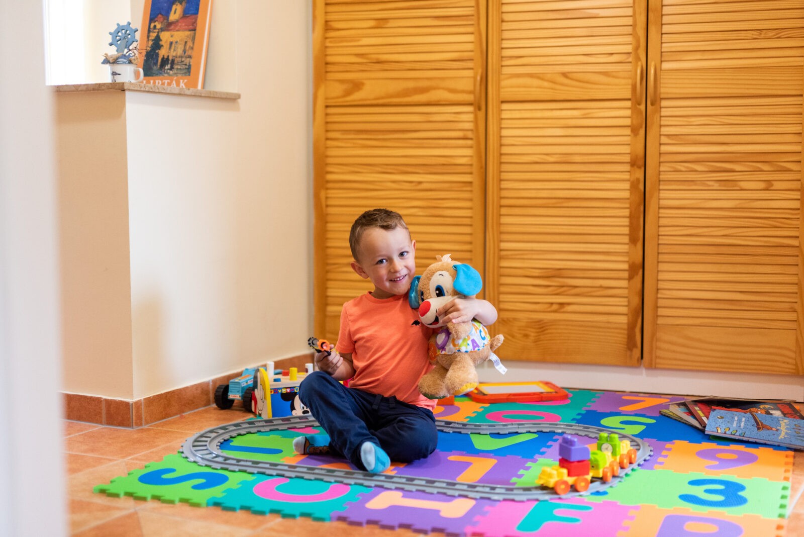 Az első képre kattintva egy virtuális sétán vehetsz rész. A nyilakra kattintva tudsz belépni a helyiségekbe. Mobilon a képernyőt simítva, számítógépen az egér bal gombját lenyomva és az egeret mozgatva tudsz szétnézni. Mik találhatók az elemelten? Két hálószoba, erkély, fürdőszoba káddal, relax & játszósarok, galéria.